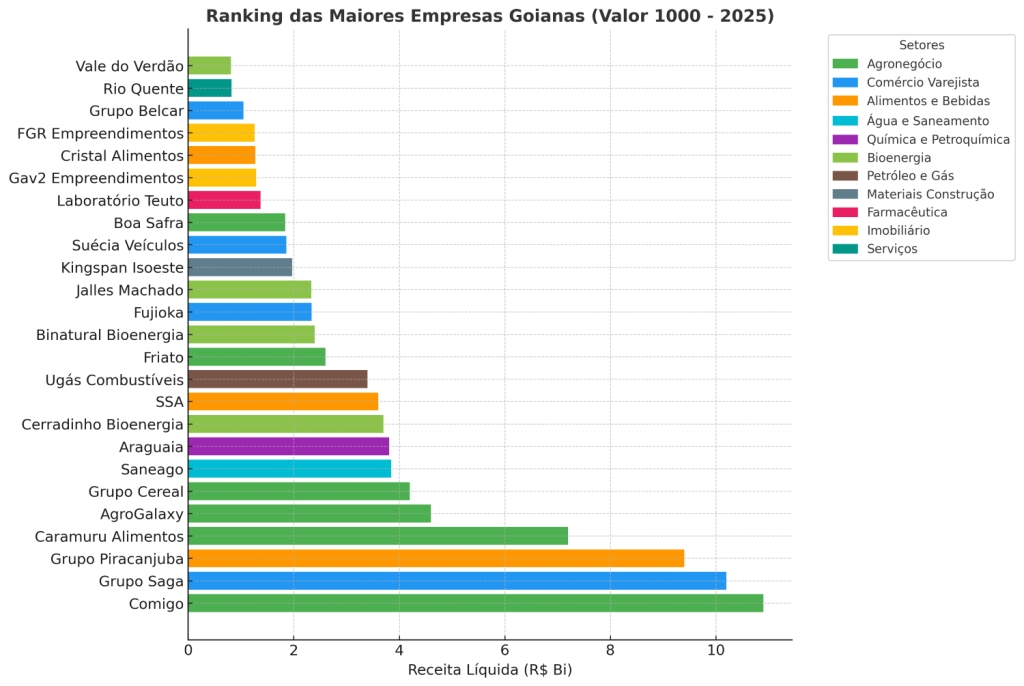 A maior empresa goiana é uma cooperativa: a Comigo. Com uma receita aproximada de R$ 11 bilhões em 2024, também foi eleita a melhor do agronegócio brasileiro e ficou na 127ª posição geral entre todas as 1 mil maiores brasileiras.