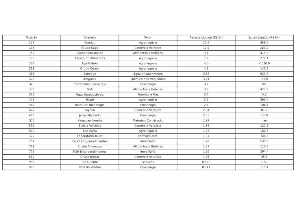 Depois da cooperativa Comigo, as maiores empresas goianas são: o Grupo Saga (R$ 10,2 bilhões de receita), o Grupo Piracanjuba (R$ 9,4 bilhões), Caramuru Alimentos (R$ 7,2 bilhões) e a AgroGalaxy (R$ 4,6 bilhões). Esta última empresa teve um lucro líquido negativo no ano passado de mais de R$ 3 bilhões e encontra-se em recuperação judicial.
